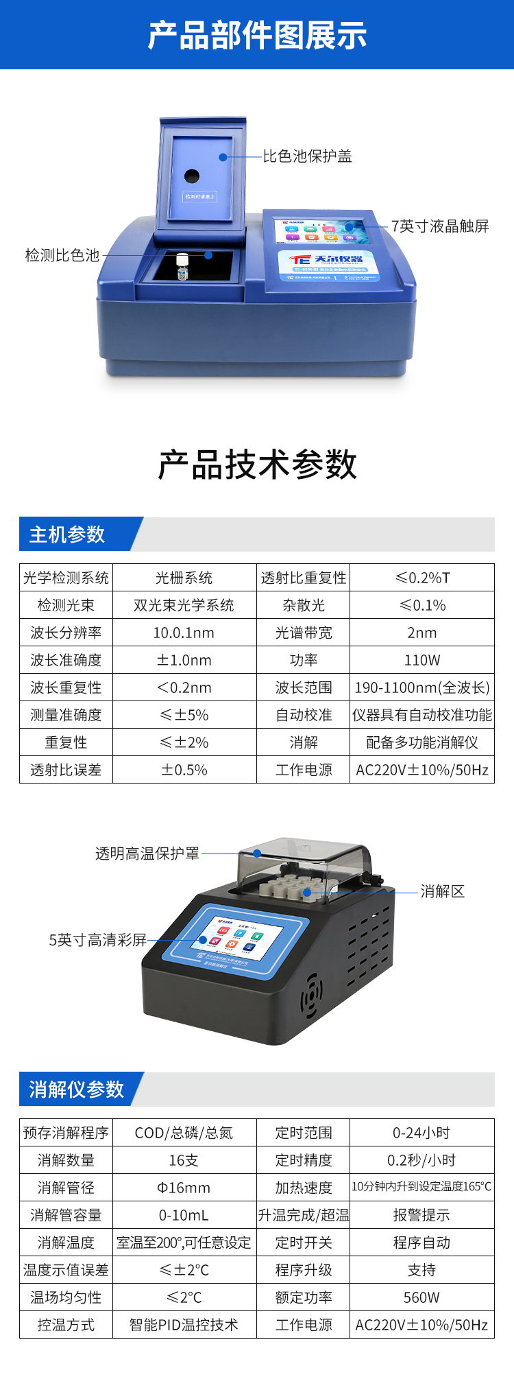 🃏准则设备:COD特用制剂1盒、挥发酚特用制剂1盒、总磷特用制剂1盒、总氮特用制剂1盒,比色皿、比色皿架、比色管架、移液枪、直接打印纸、发应管、安全使用就说明工作手册、厂品出厂合格证证、检测仪器包装箱明细清单表、返修卡 。