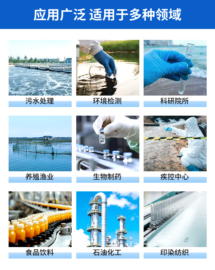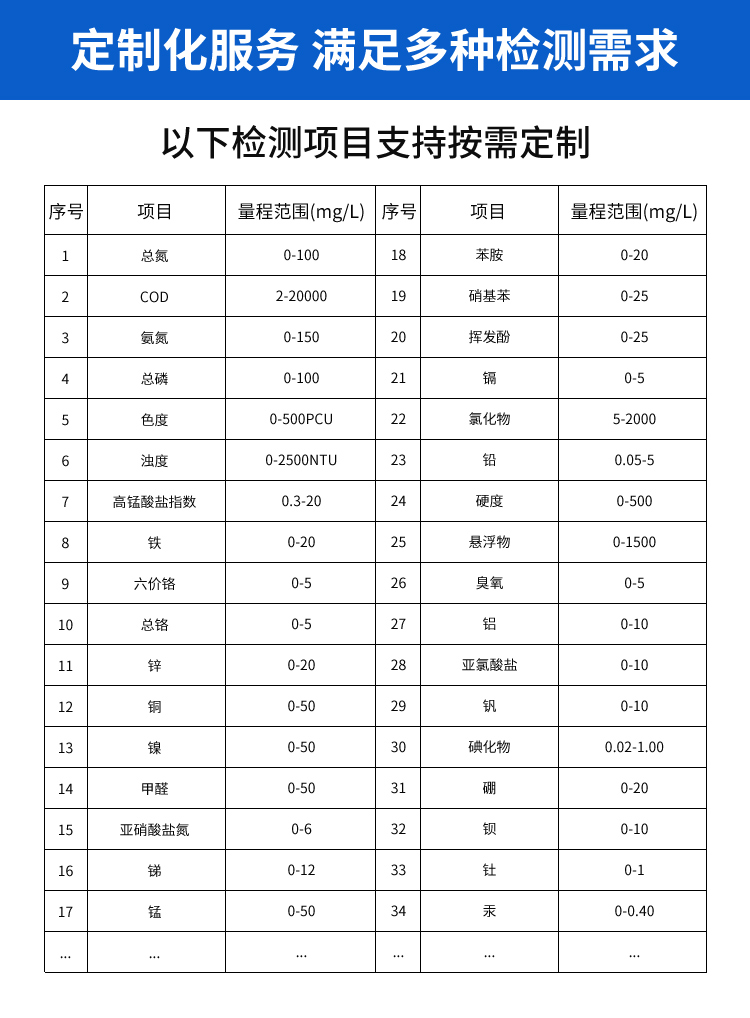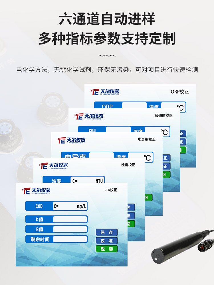 检测项目:COD、TOC、氨氮、浊度、悬浮物、叶绿素、蓝绿藻、余氯、pH、溶解氧、温度、电导率、ORP、 TDS、水中油(可定制项目)